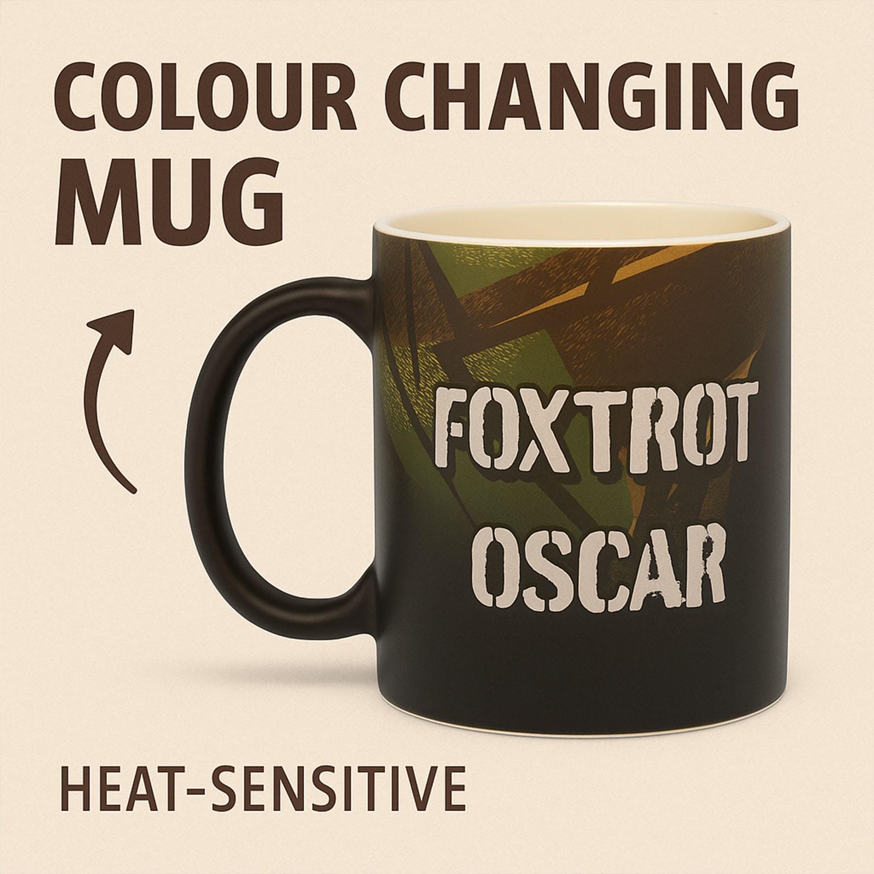 Foxtrot Oscar,, funny colour changing mug, perfect gift for the man in your life or the foul-mouthed friend.