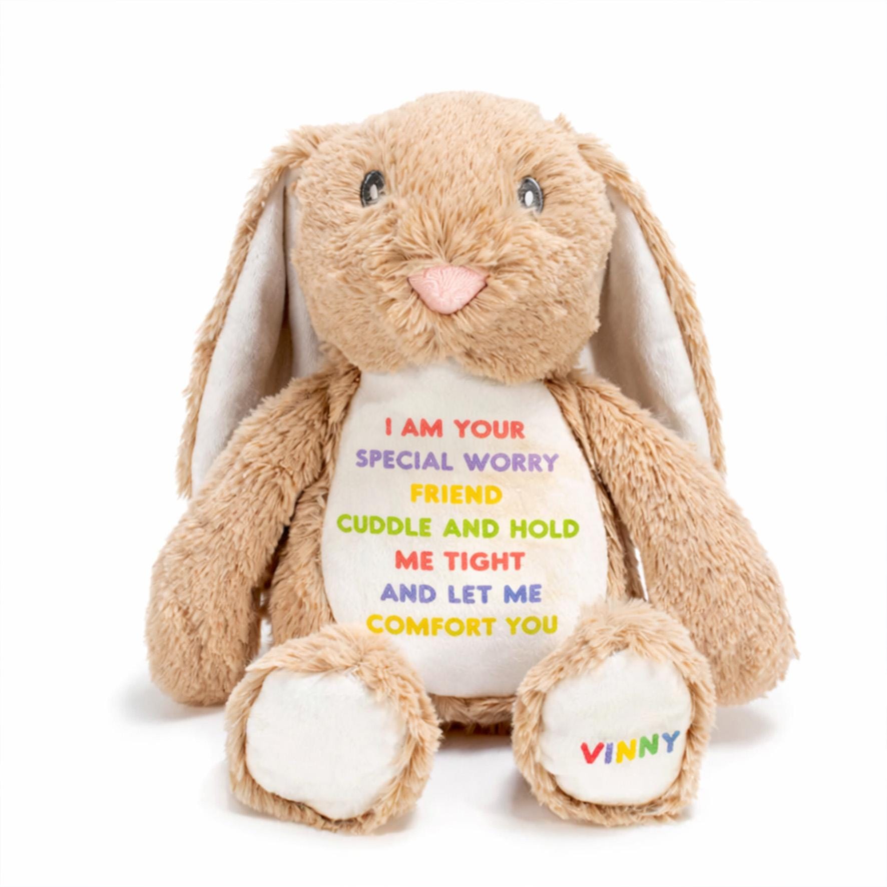 Each bunny features a reassuring printed message on its tummy and can be personalised with your child’s name on the right foot, making it a truly special companion they can hold close whenever they need comfort.